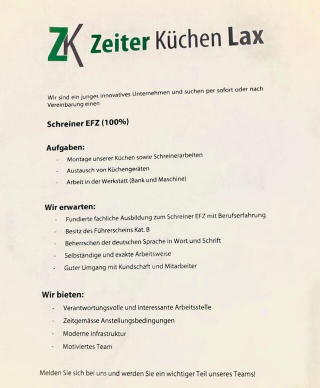 Eine Frage vorweg: kannst du gut mit Holz? Wenn ja, und falls du ein fähiges und doch lustiges Team (kreative Zeichnerin, exakte Buchhalterin, theaterspielender Schreiner, halb Bauer-Schreiner, maschinenverliebter Werkstattprofi und einen motivierenden Chef), ab und zu gemeinsame Feierabendbierchen, entspannte Teamanlässe, einen humanen Arbeitsbeginn um 8 Uhr, grossartige Kunden, einen eigenen voll ausgestatteten Firmenbus, eine top ausgestattete Werkstatt und einen fairen Lohn magst, bist du unser/e Traumkandidat/in. Melde dich nicht bei uns, wenn du nicht ab und zu gerne lachst, wenn du nicht bis 3 zählen kannst, wenn du keinen geraden Satz mit unseren Kunden reden kannst, wenn du Ananas auf deine Pizza machst (da kennen wir leider kein Pardon) oder wenn du stur und nicht teamfähig bist. Ansonsten: ran an dein Mail (manolito.kreuzer@zeiter-kuechen.ch) oder ans Telefon (078 627 64 97) und melde dich beim Chef höchstpersönlich. Wir freuens uns über dein Interesse an uns und auf dich. #job #jobangebot #schreiner #goms #lax #arbeitenwoandereferienmachen #handwerk #handwerker #traumteam #traumkueche #traumküche #w