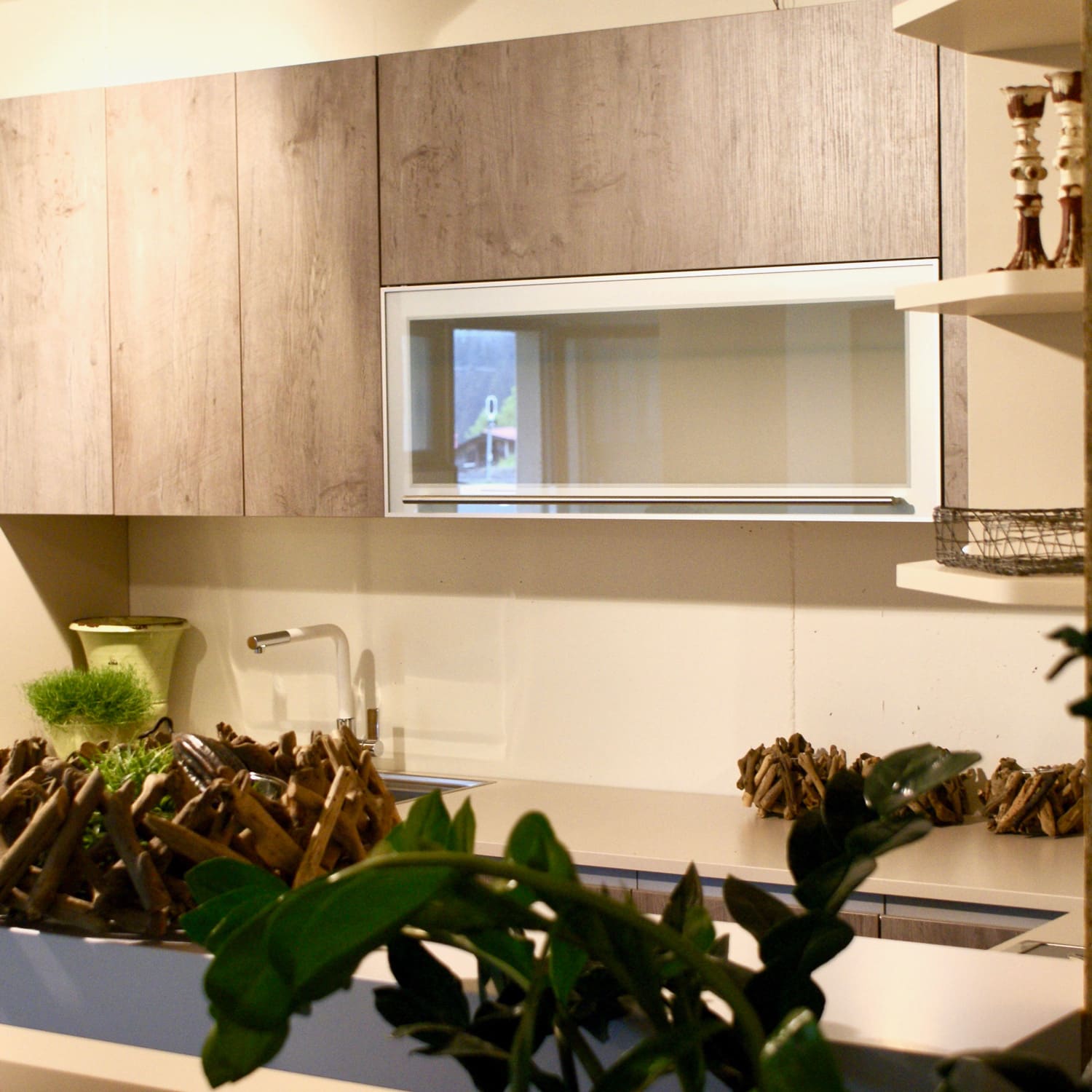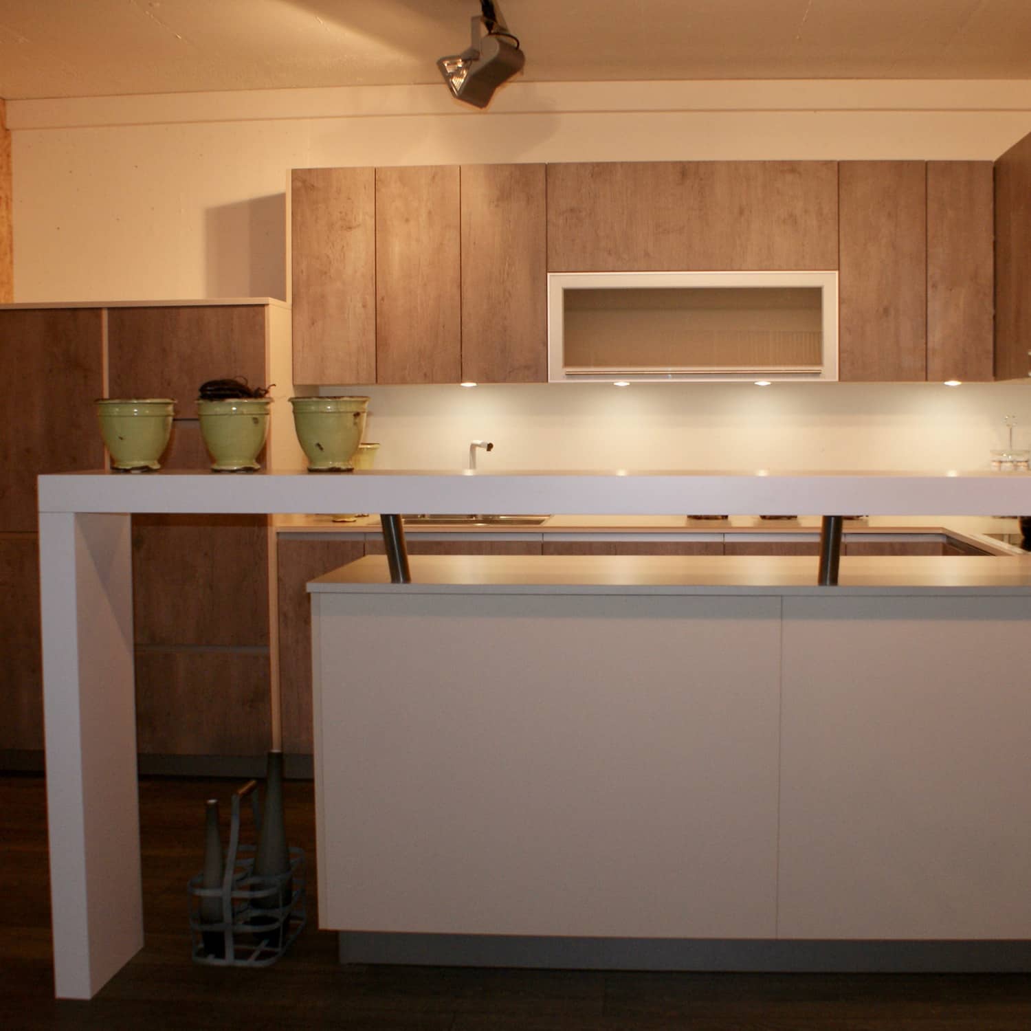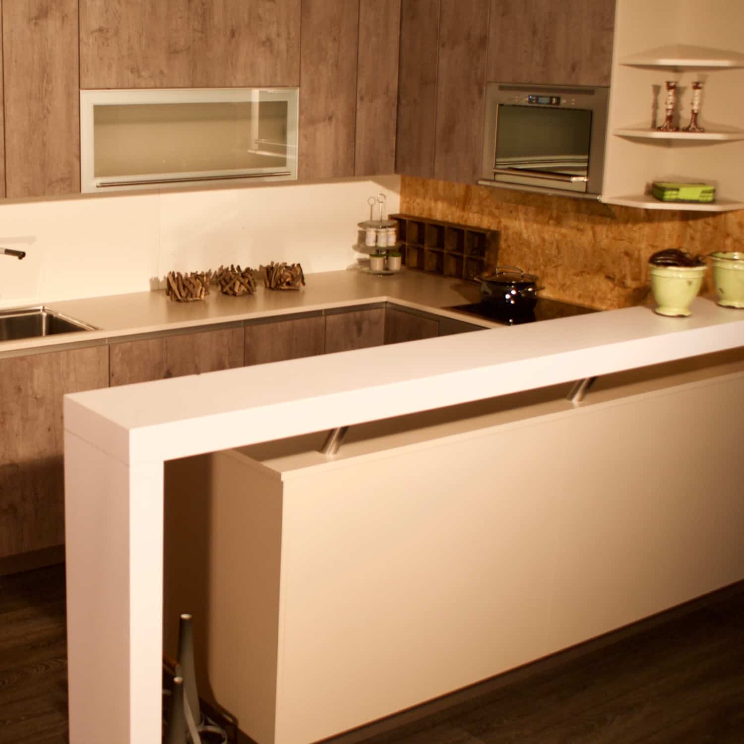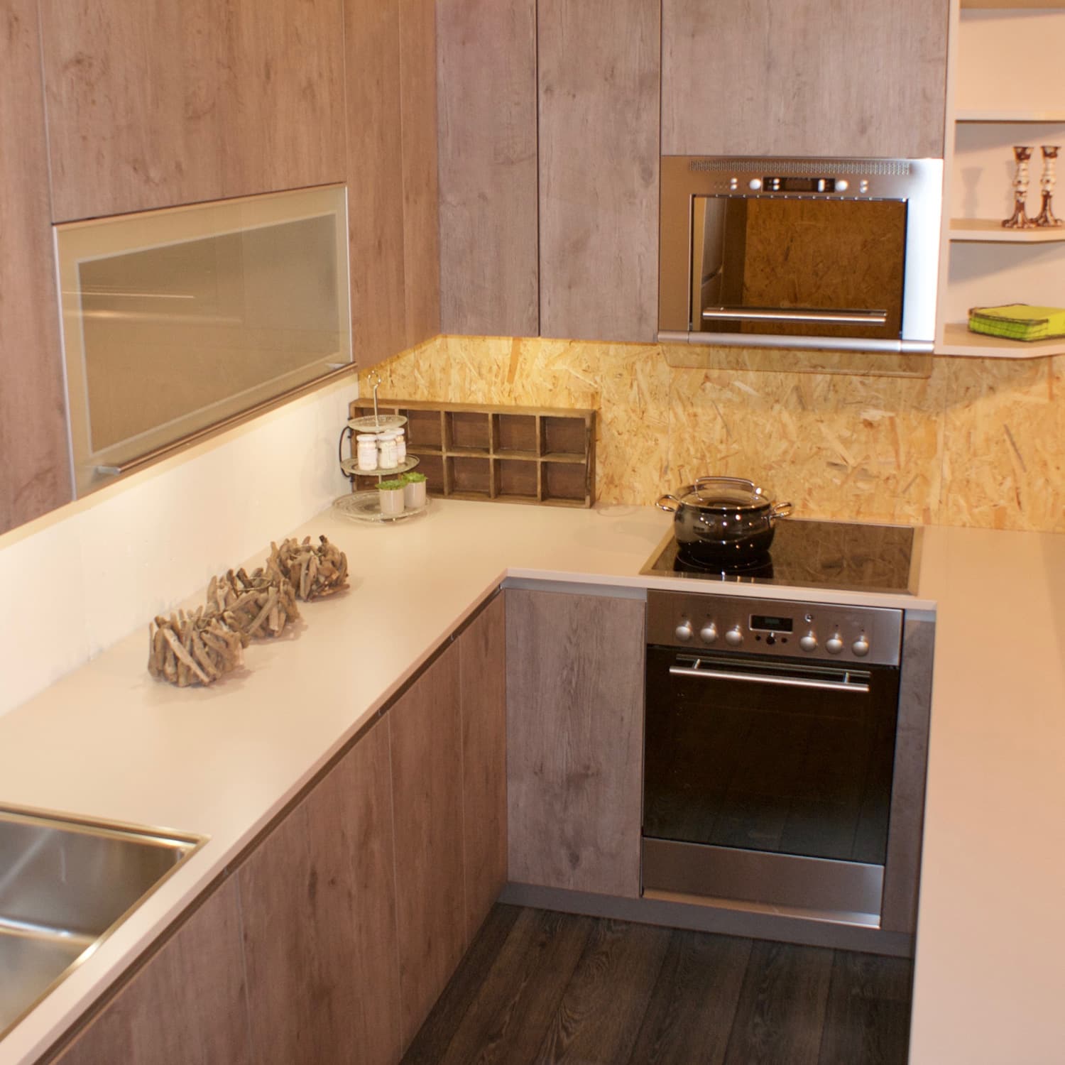 Diese schöne Ausstellküche errinnert an ein heimeliges Chalet und ein gemütliches Zuhause. Darüber hinaus ist sie topmodern mit allen gängigen Küchengeräten ausgestattet und die schöne Bar lädt zum Verweilen und Plaudern während des Kochens ein.
